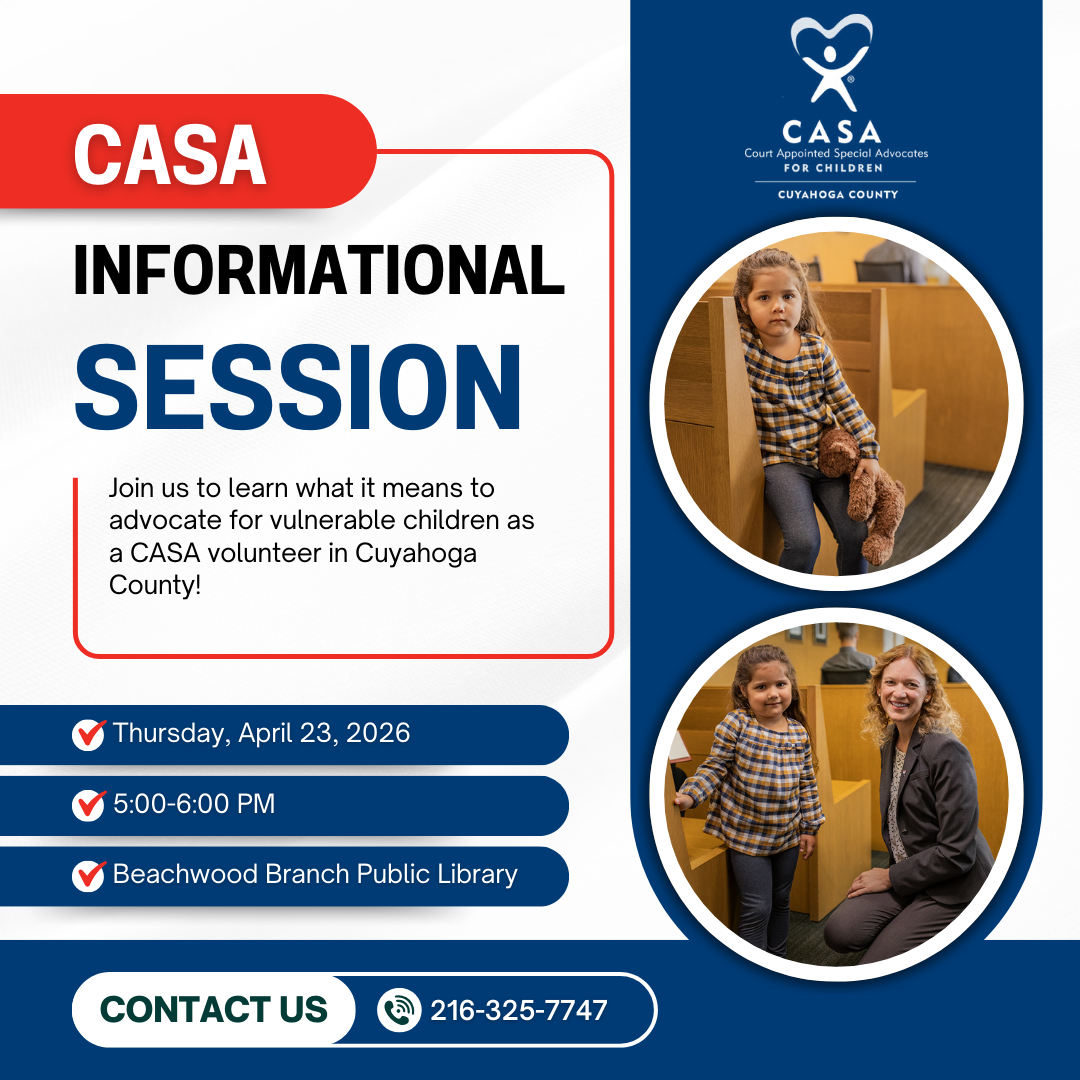 The one-hour session will provide information about the role of the CASA volunteer in Cuyahoga County and how our volunteers advocate for children who have been abused and neglected in Cuyahoga County.